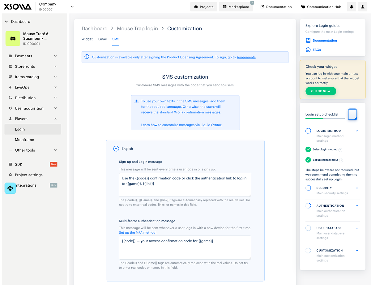 SMS customization is available only after you sign the Xsolla Product Licensing Agreement. To sign the agreement, go to the Agreements section in your Publisher Account.