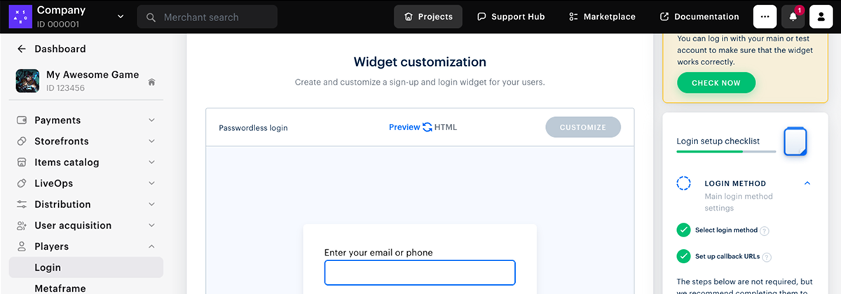 - Open your project in Publisher Account and go to the Players > Login section.