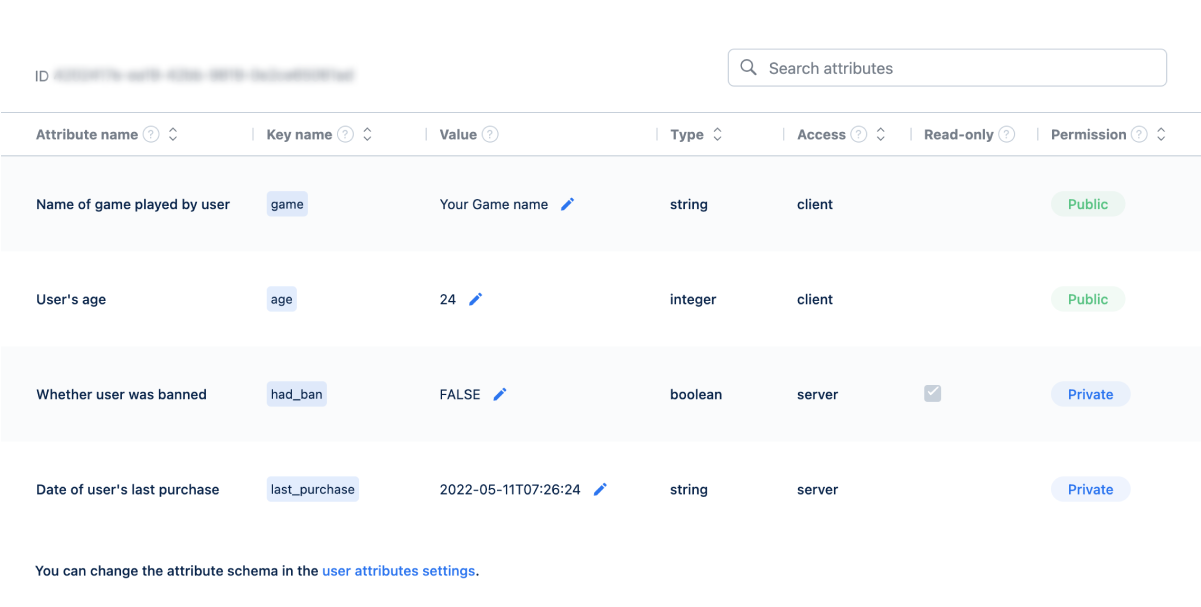 - Read-only. The values for this type of attributes are entered and edited on the server side of your application. We recommend that you use them for configuration of game character stats or user parameters that shouldn’t change regularly. For example, chance to get a bonus, game character key parameters, user categories, etc.