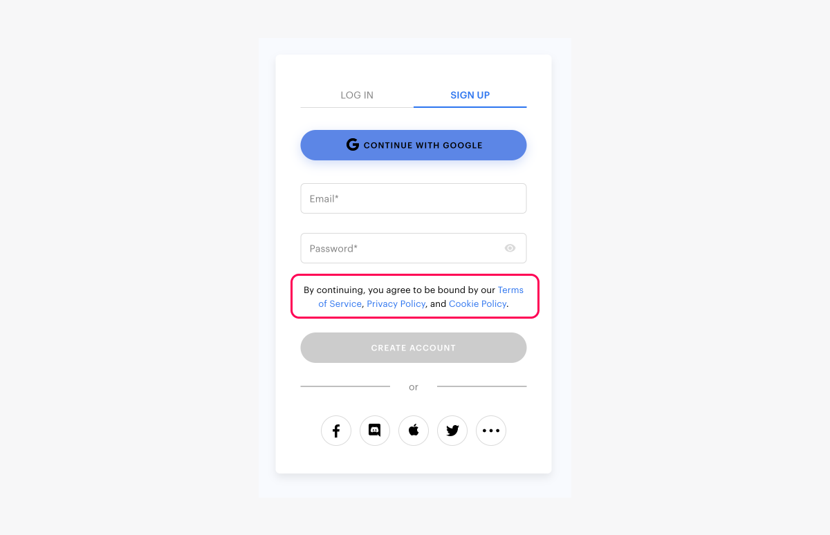 - When social login is set up, links to terms and policies are displayed on the social network page.