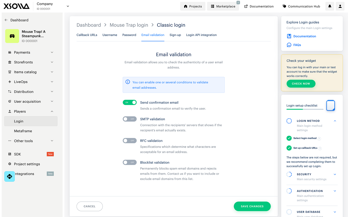 - Open your project in Publisher Account and go to the Players > Login section.