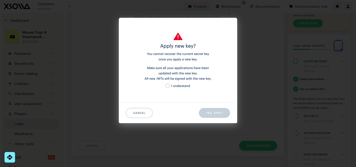 - If your actions led to a change in the current token validation key (algorithm change or reset of the current key), the Login product will ask for confirmation to apply the new key.