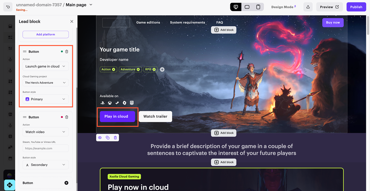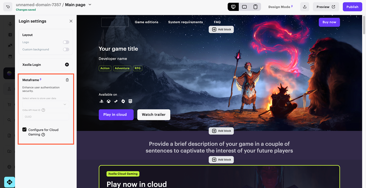 - Erstellen Sie eine Website mithilfe des Xsolla Site Builder.