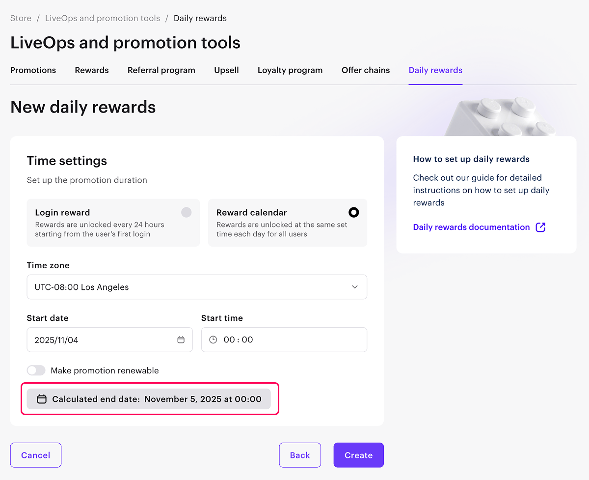- Legen Sie das Startdatum und die Uhrzeit für die täglichen Belohnungen fest.