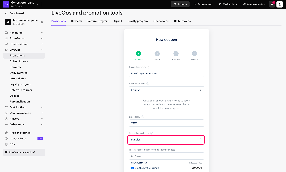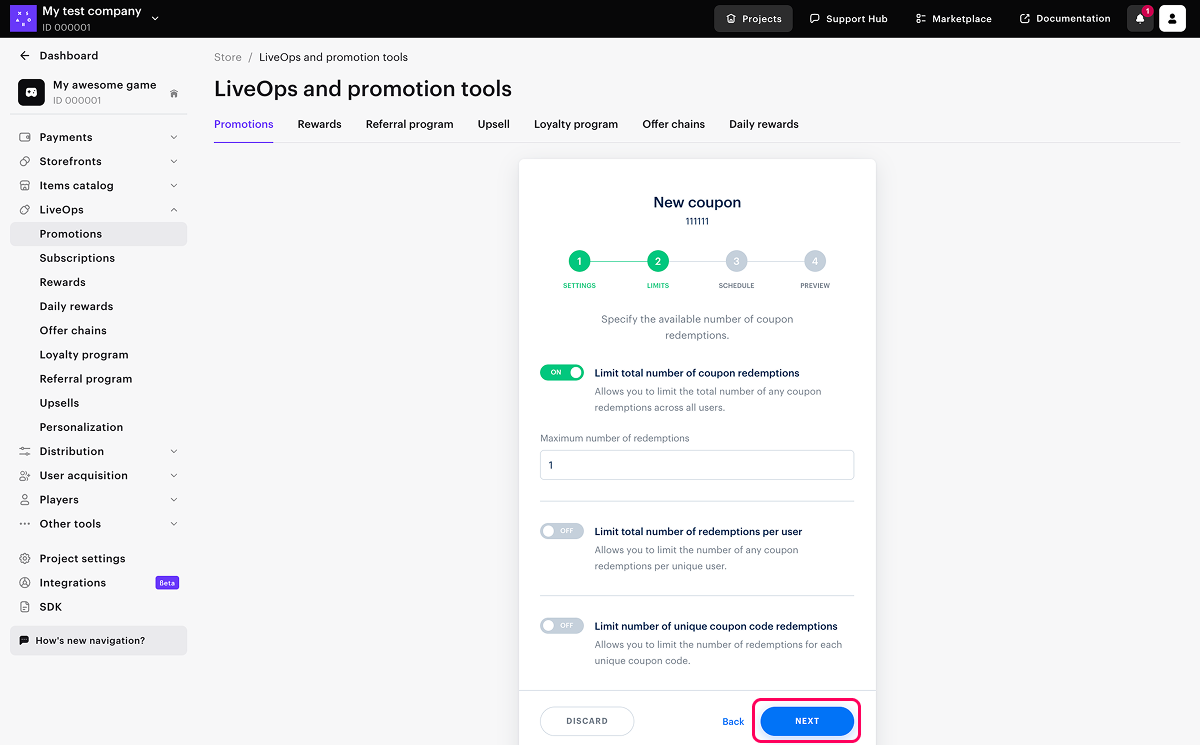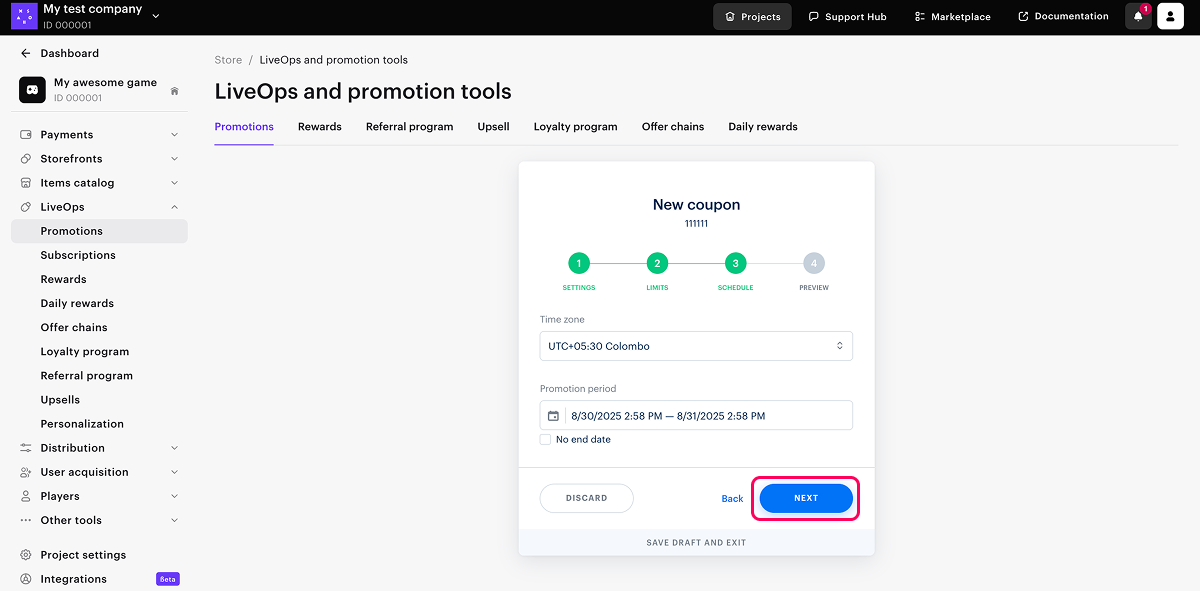 - Erstellen Sie eine Promocode- oder Gutscheinaktion unter LiveOps > Werbeaktionen.