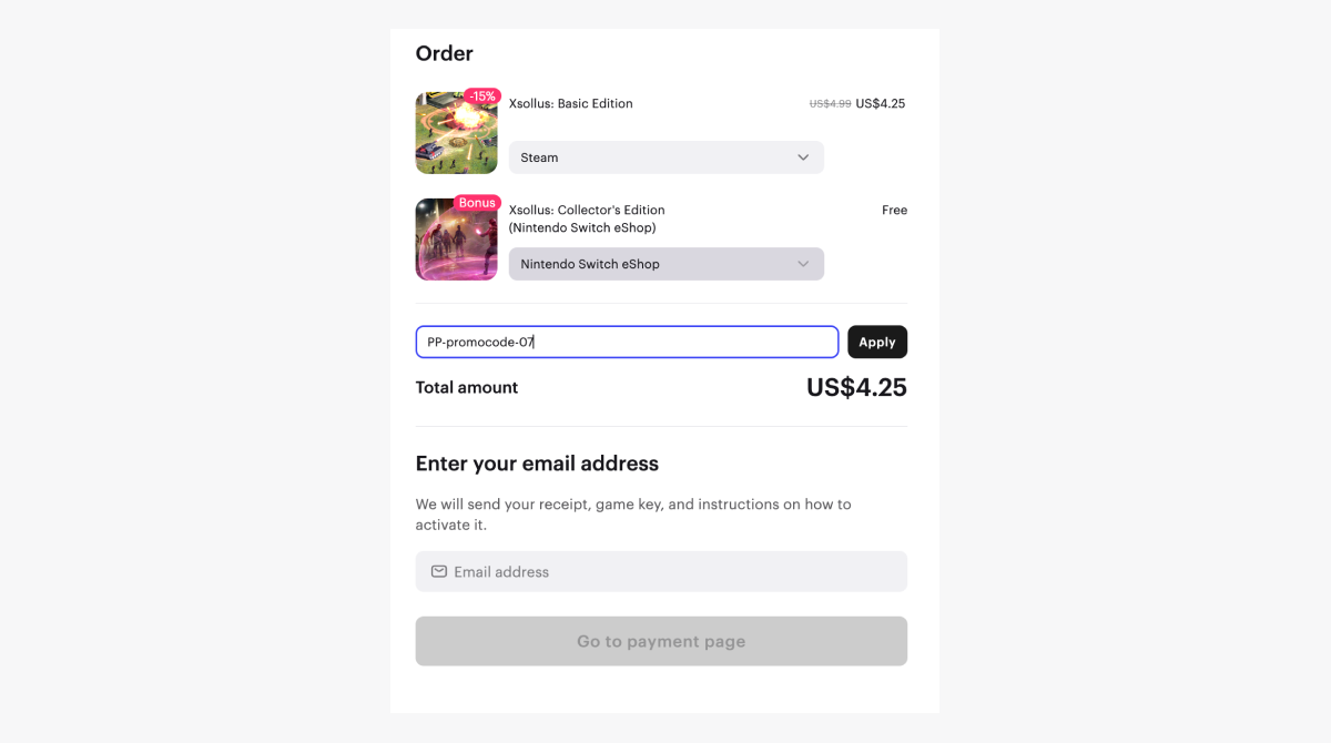 Gleichzeitig wird aufseiten von Xsolla ein Warenkorb angelegt, der dem Benutzer jedoch nicht angezeigt wird. Das ist notwendig, um alle vorhandenen Rabatte korrekt anzuwenden und den Betrag einschließlich aller Rabatte in der Zahlungsmaske anzuzeigen.