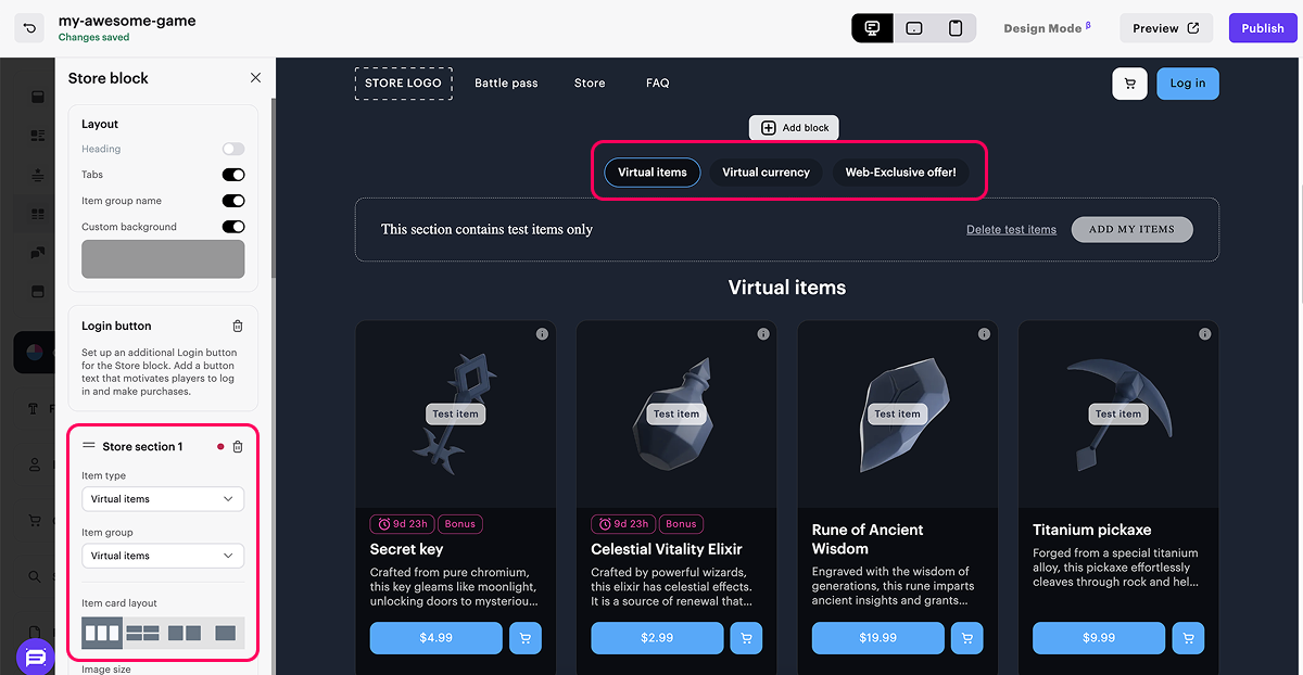 - Konfigurieren Sie den Online-Shop-Block, in dem virtuelle Gegenstände, Bundles und virtuelle Währungspakete angezeigt werden: