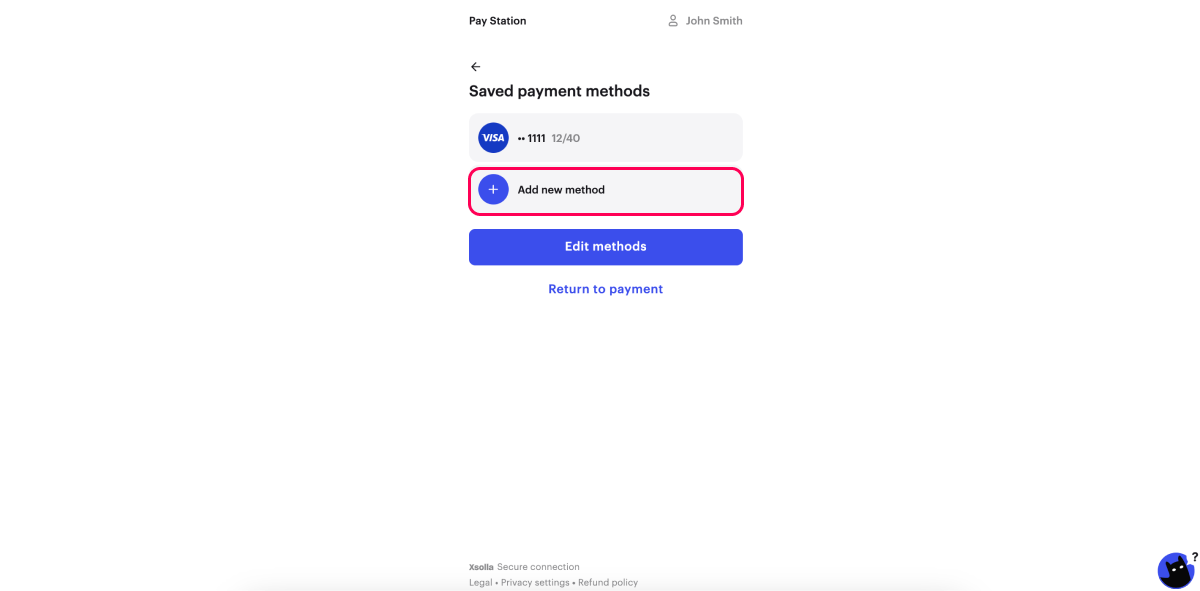 Saved card will be displayed in the Saved methods section.