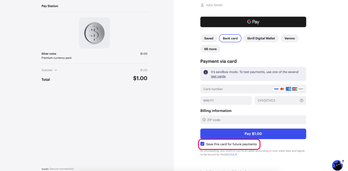 - Save card in the sandbox mode.