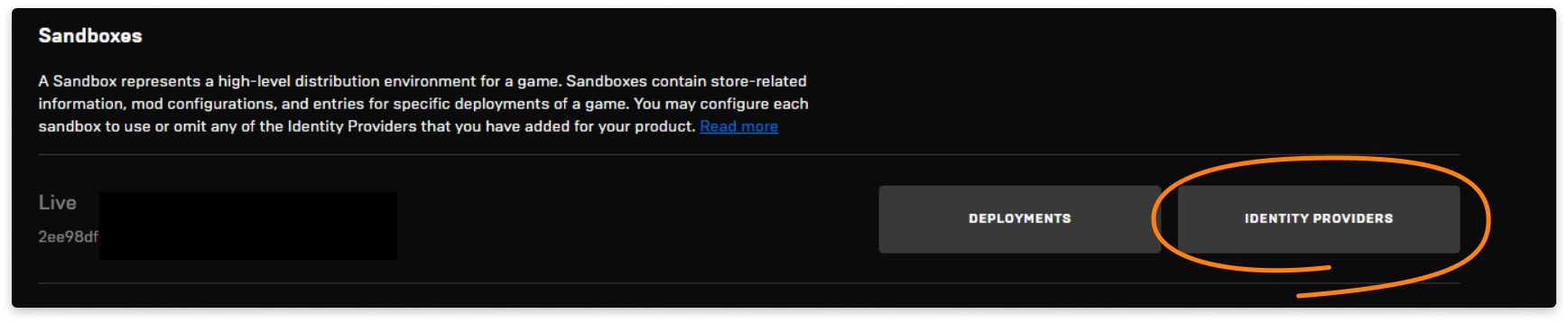 - Add the created identity provider to a Sandbox. To do it, go to the Sandboxes section and press IDENTITY PROVIDERS.