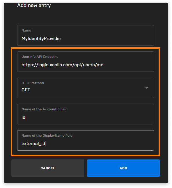 https://login.xsolla.com/api/users/me. This URL is the Xsolla Login method to which Epic will send a request to access user data. As a response, it receives a JSON file with user data; - In the HTTP Method, select GET;