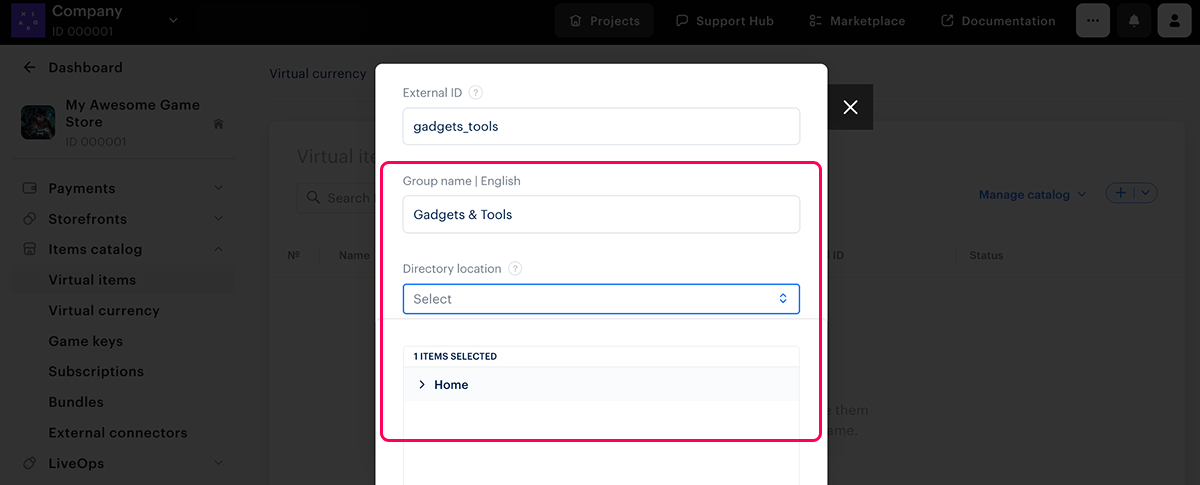 - Open your project in Publisher Account and go to the Items catalog > Virtual items section.