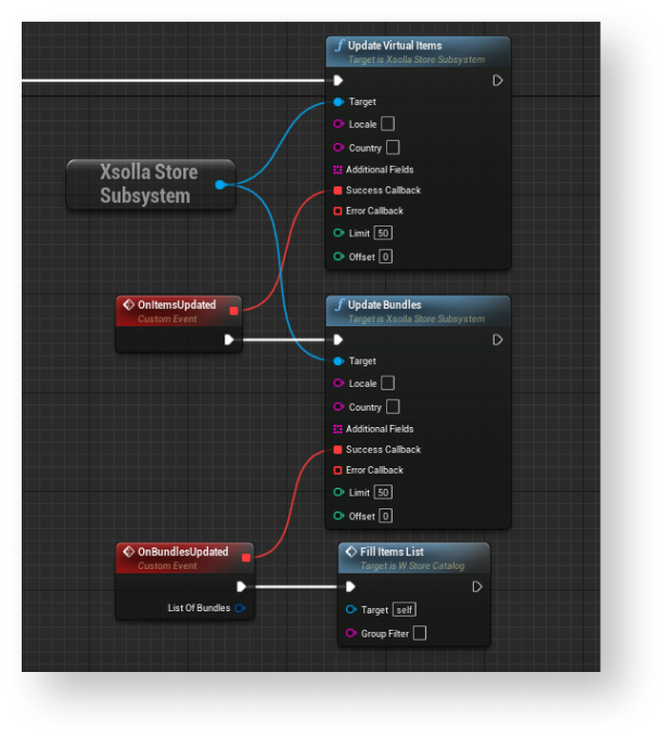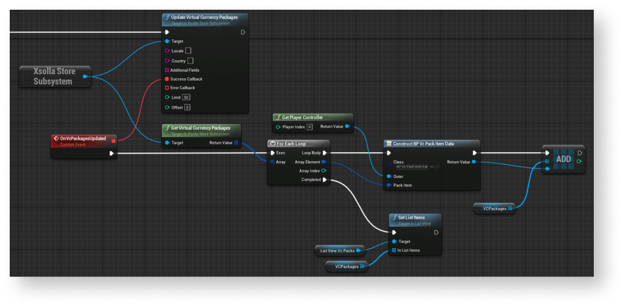 UpdateVirtualCurrencyPackagemethod call connected with theXsollaStoreSubsystemobject to theEventConstructnode and add passing of data entered by users. - Implement logic for adding a package to the list. The action should be done while processing a successful update of local cache of virtual currency packages. To do this, add nodes as shown in the following picture.
