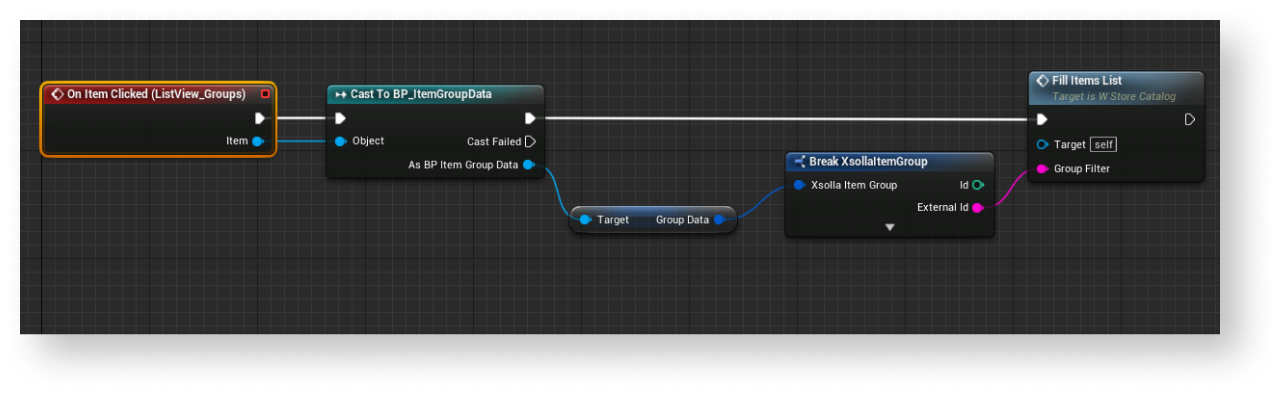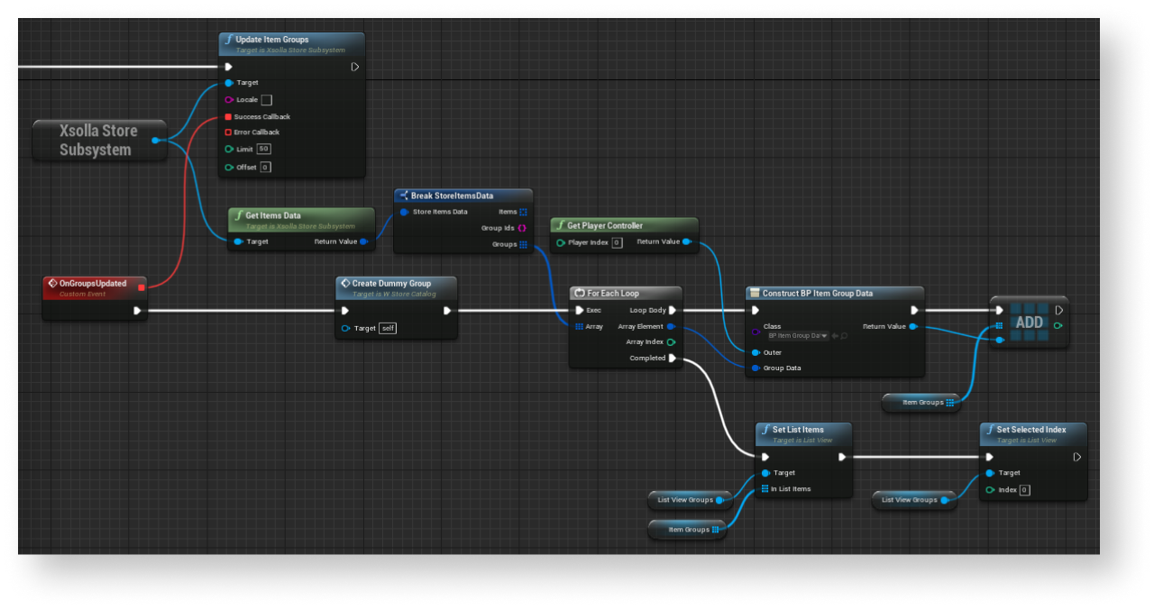 UpdateItemGroupsSDK method call connected with theXsollaLoginSubsystemobject to theEventConstructnode and add passing of data entered by users. - Implement logic for adding items to the group. The action should be done while processing a successful update of local cache of virtual item groups. To do this, add nodes as shown in the following picture.