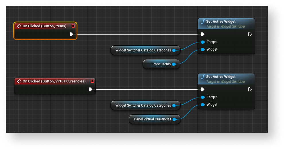 Graph view. - Implement logic for clicking a button for purchasing an item. To do this, add the nodes as shown in the following picture.