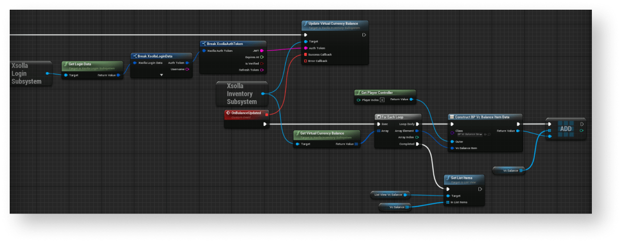 UpdateVirtualCurrencyBalancemethod call connected with theXsollaInventorySubsystemobject to theEventConstructnode. - Implement logic for filling out the list of virtual currencies. The action should be done while processing a successful update of the local cache of the virtual currency balance. To do this, add nodes as shown in the following picture.