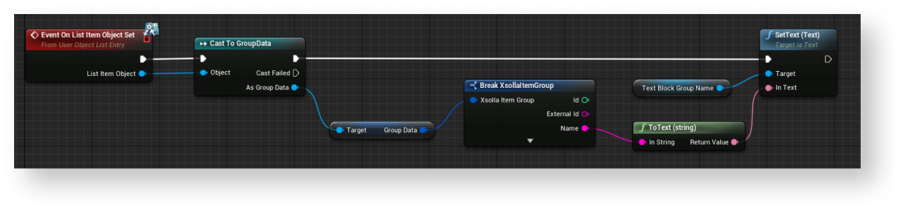 EventOnListItemObjectSetnode to create an element of the list and initialize the widget. - Pass the value from the object that contains data about the group to the element with the name of the group. To do this, add nodes as shown in the following picture.