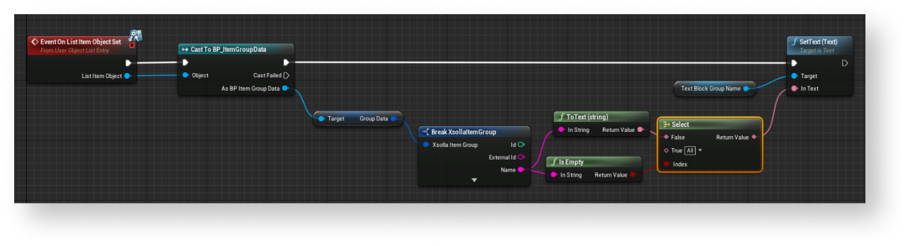 - Implement logic for highlighting a group of items that is selected in the list. To do this, add nodes as shown in the following picture.