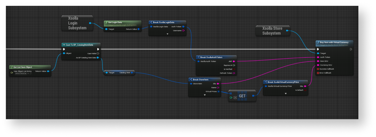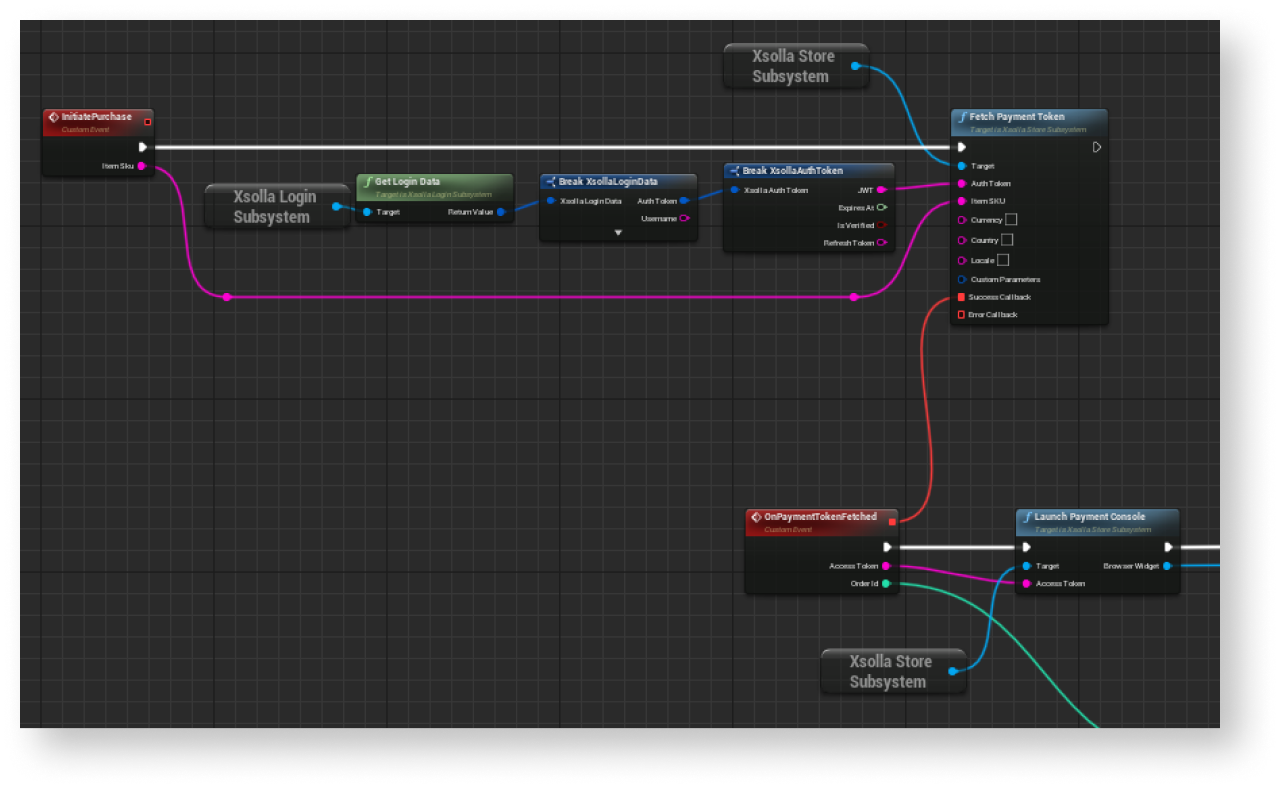 InitiatePurchasenode and connect theFetchPaymenTokenSDK method call linked to theXsollaStoreSubsystemobject to the added node. - To the