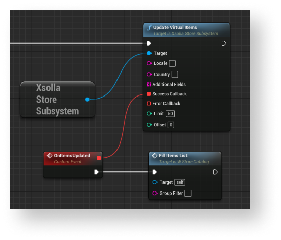 UpdateVirtualItemsSDK method call connected with theXsollaLoginSubsystemobject to theEventConstructnode and add passing of data entered by users. - Implement logic for adding items to the group. The action should be done while processing a successful update of local cache of virtual item groups. To do this, add nodes as shown in the following picture.