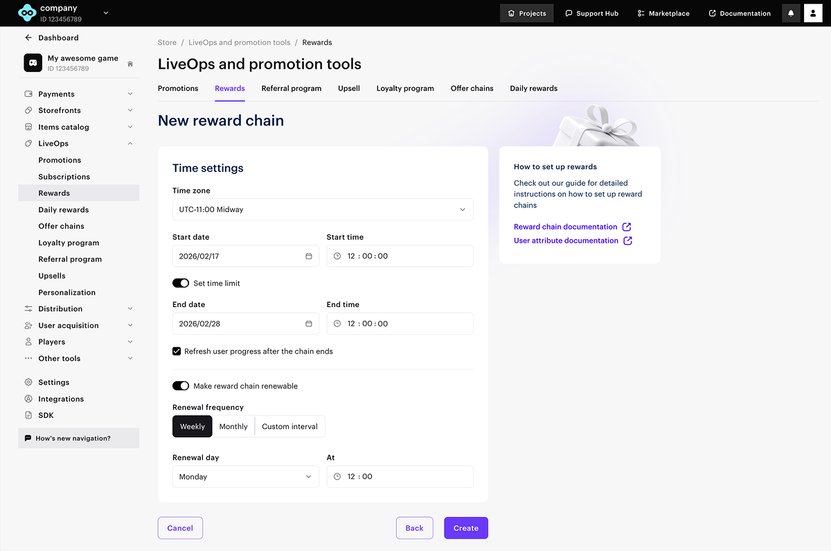 - Si quiere que la cadena de recompensas se renueve en un momento determinado, active la opción Make reward chain renewable y especifique el modo de actualización.