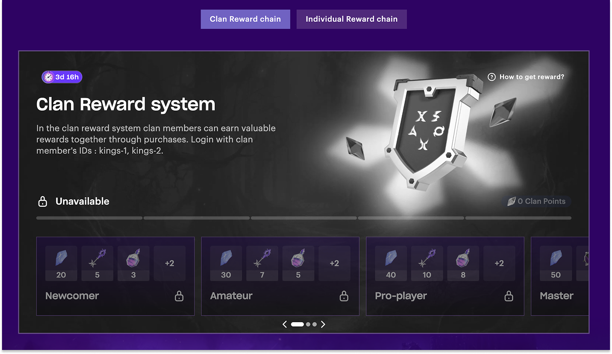 Tiene 2 cadenas de recompensas configuradas: una cadena de recompensas individual y una cadena de recompensas de clan. La cadena individual tiene un punto de valor llamado