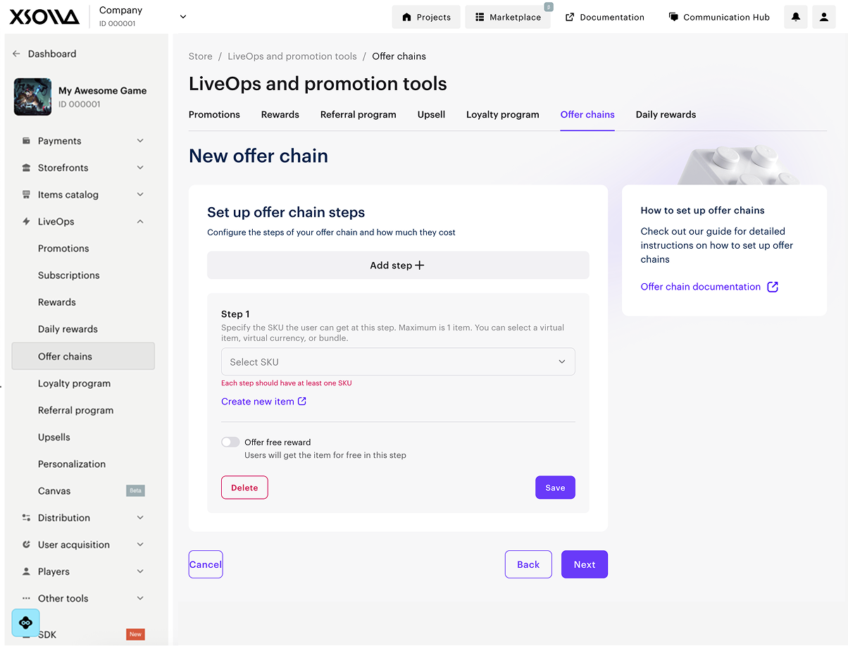 - Ouvrez le projet dans le Compte éditeur et accédez à la section LiveOps > Offer chains.