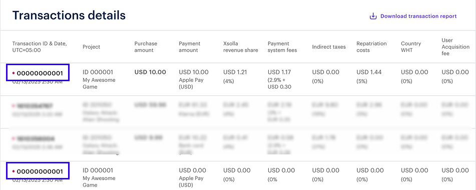 Vous trouverez des informations sur les frais dans la section Accounting > Transaction registry du Compte éditeur. Pour ouvrir une carte de transaction, cliquez sur l’ID de la transaction.