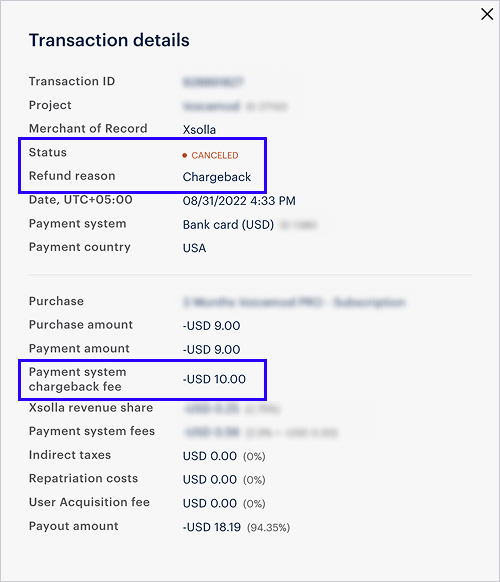 - Dans la carte d’une transaction remboursée pour motif de chargeback. Le montant des frais est affiché dans le champ Payment system chargeback fee.