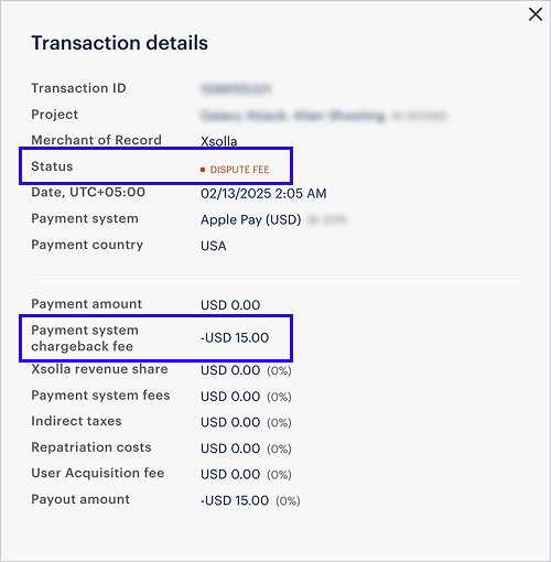https://api.xsolla.com/merchant/v3/merchants/{merchant_id}/reports/transactions/{transaction_id}/details. Les informations sur les frais de chargeback sont renvoyées dans le paramètre finance_details.dispute_fee de la réponse.Faute de frappe ou autre erreur dans le texte ? Sélectionnez le texte concerné et appuyez sur Ctrl+Entrée.
