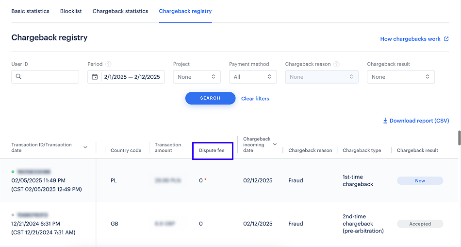 Pour obtenir un rapport sur toutes les contestations pour une période donnée, cliquez sur Download report (CSV). Les frais de chargeback s’affichent dans la colonne