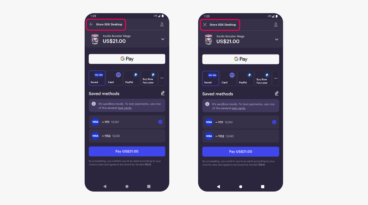 Nous recommandons de configurer un bouton de fermeture pour l’interface de paiement, étant donné que la barre de navigation et les éléments de navigation standard ne sont pas visibles à l’utilisateur dans WebView et Trusted Web Activity. Pour ce faire, dans l’objet PaymentOptions, dans le paramètre ui.mobile, passez l’objet mobile = UiMobileProjectSettingHeader avec le paramètre closeButton=true.