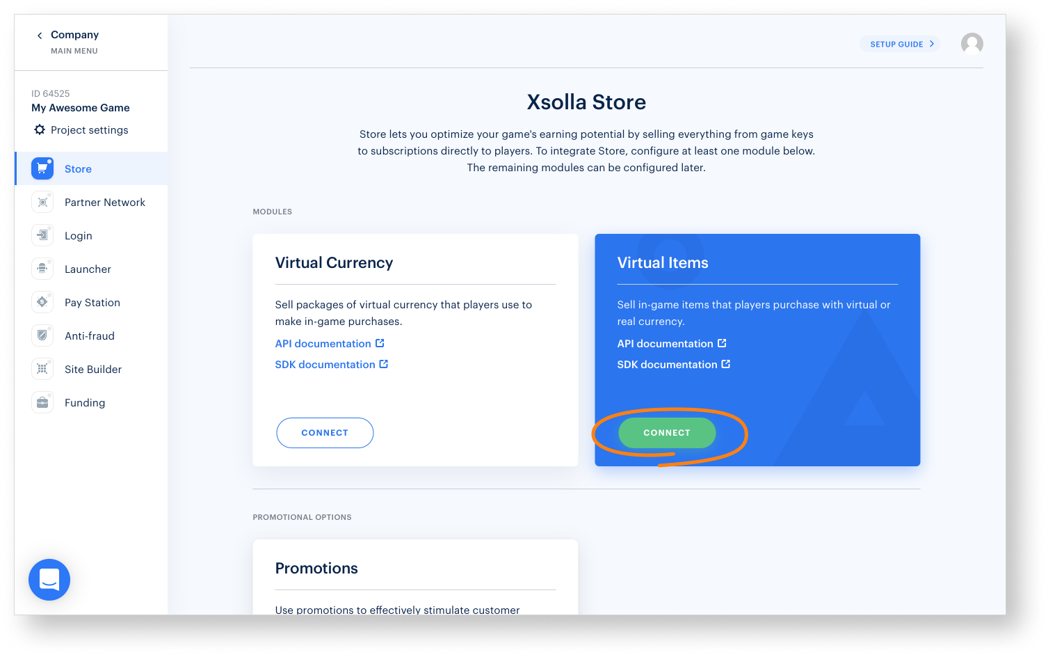 - Click Connect in the Store pane. You can go to the Shop Builder settings from any section of Publisher Account by clicking the Store in the side menu.