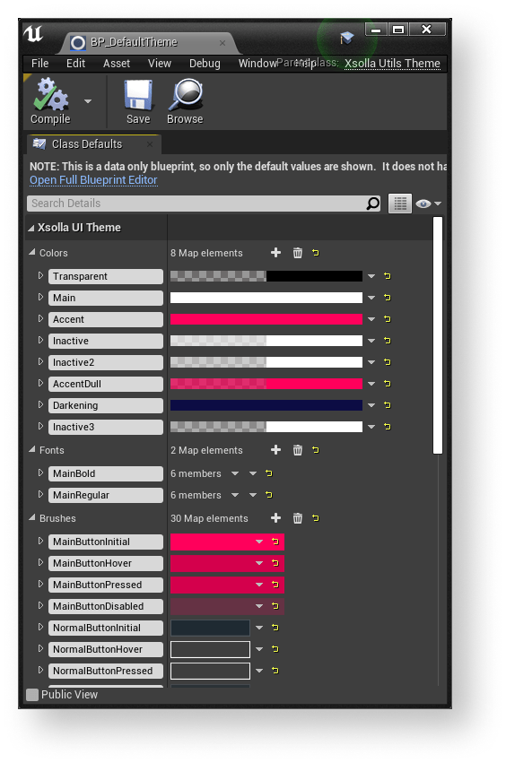 Theme is a XsollaUtilsTheme type asset. It contains the list of colors, fonts, and textures that are used by the UI elements. Every list is a set of key-value pairs where the key is a unique name of a theme parameter, and the value is a corresponding color, font, or texture.