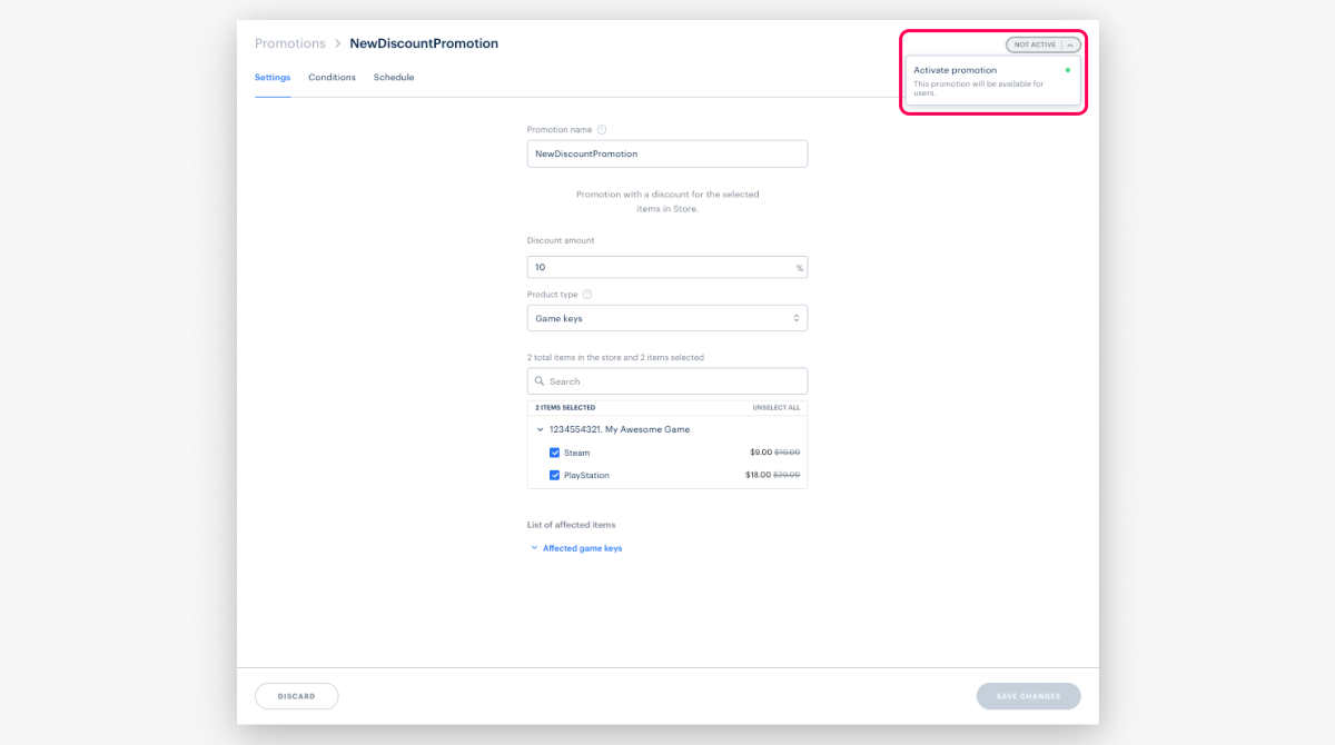 - Configurer une remise sur certains DRM du jeu. Passez un tableau contenant les SKU des DRM requis à la méthode Créer une promotion par réduction pour un objet ou Mettre à jour une promotion sur les objets.
