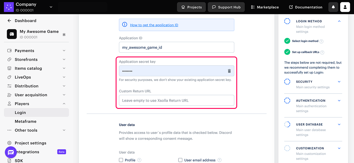 - Vous permet de combiner la sécurité de Xsolla Login avec l’avantage d’utiliser un ID utilisateur provenant du jeu. Le widget Xsolla Login fonctionne indépendamment du client du jeu : l’intégration avec le jeu est gérée via des webhooks. L’ID utilisateur lié est utilisé pour octroyer rapidement les achats à l’utilisateur dans le jeu et offrir des promotions personnalisées.