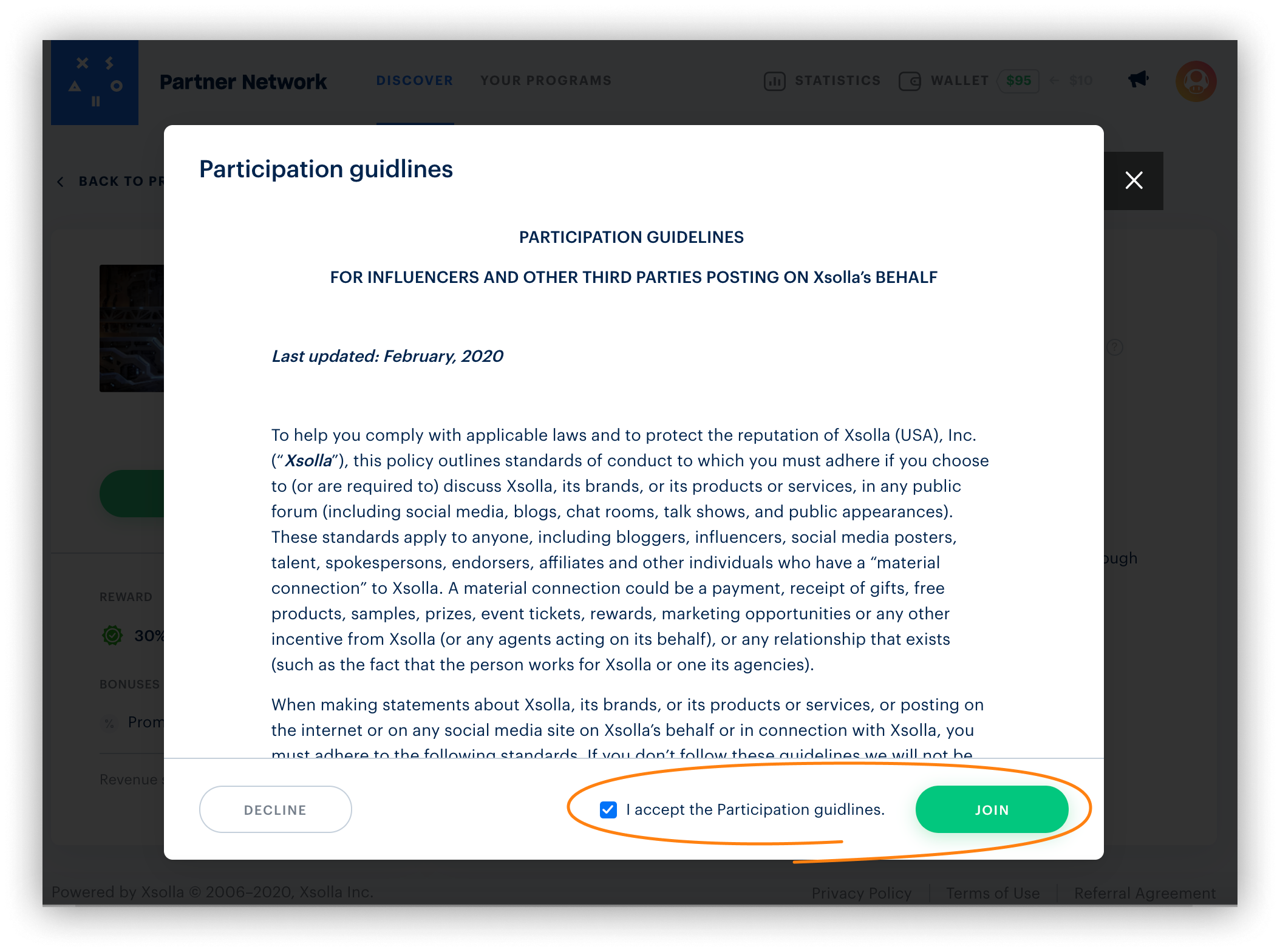 - Le créateur voit une fenêtre modale avec le texte des Directives de participation. Il coche la case I accept the Participation Guidelines après les avoir lues et clique sur Join.