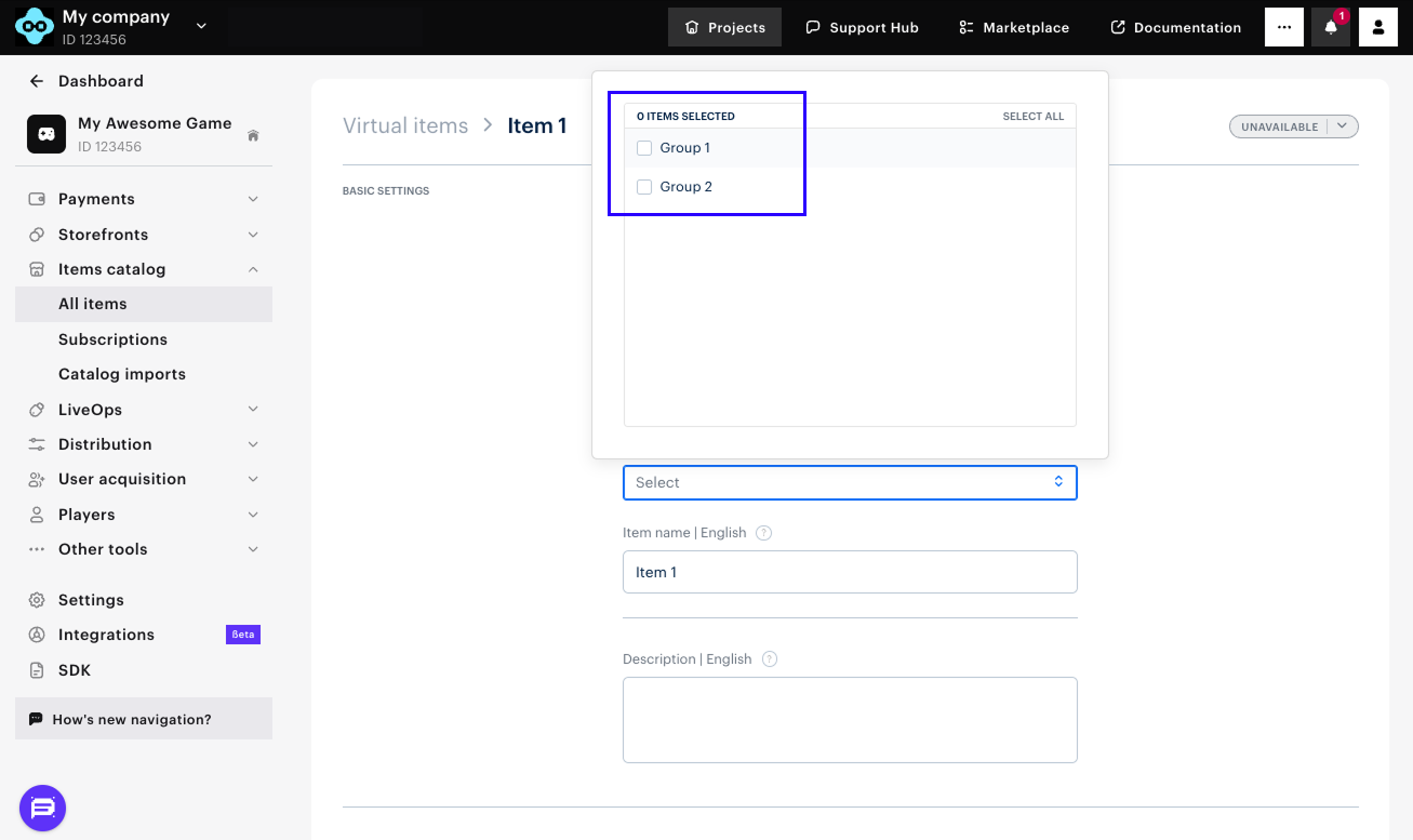 - Open your project in Publisher Account and go to the Items catalog > All items section.