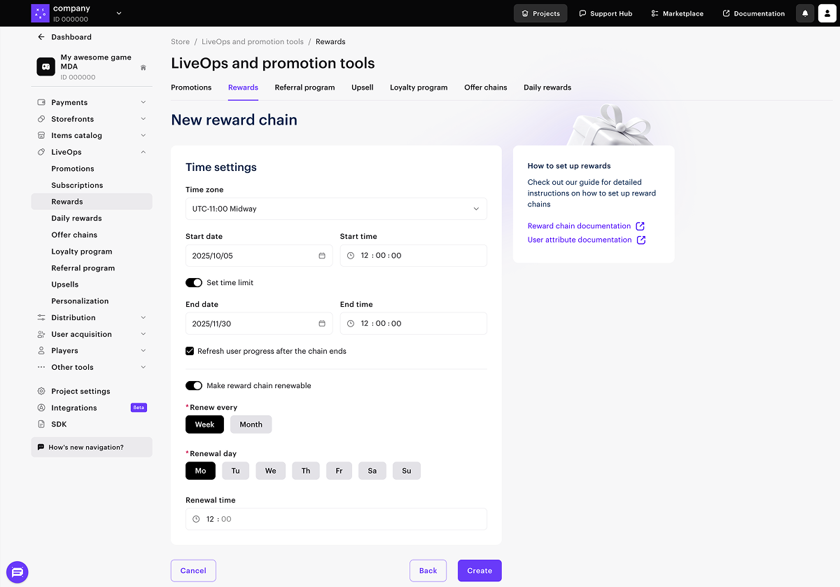 - 特定の日時にリワードチェーンを更新したい場合は、「報酬チェーンを更新可能にする」トグルを「オン」にし、更新モードを指定してください。