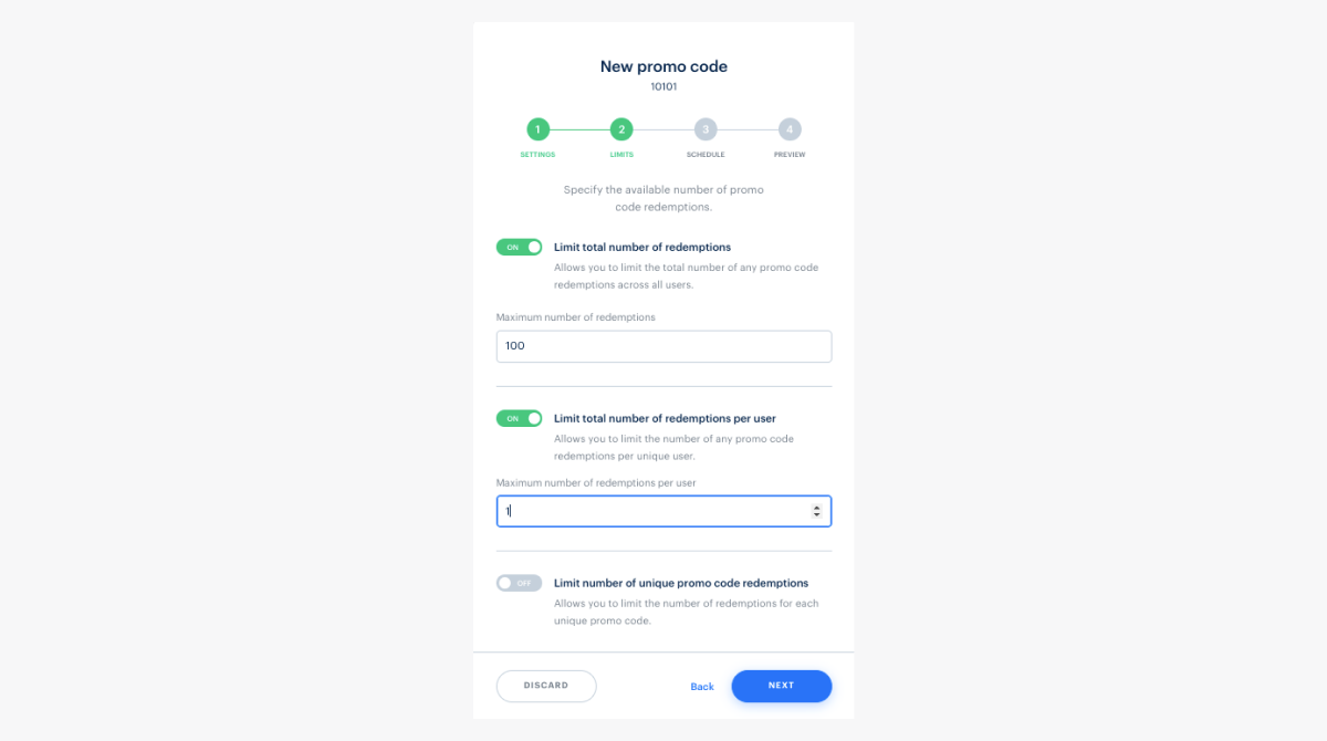 - 캠페인 내에서 한 사용자의 프로모션 코드 사용 횟수를 제한합니다