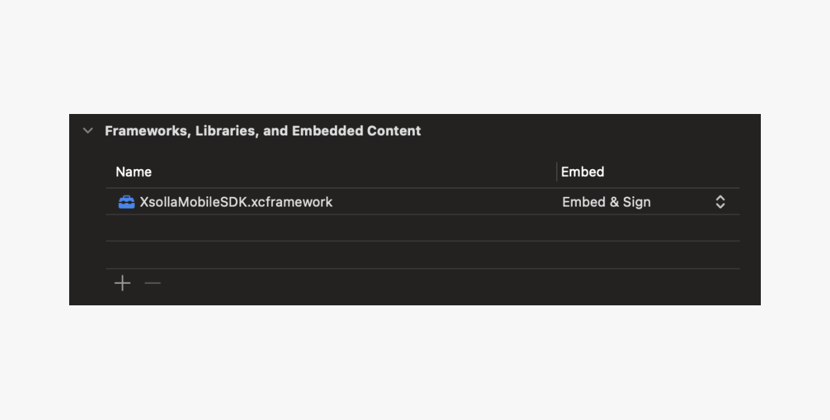 XsollaMobileSDK.xcframework파일을 가져다 놓습니다. - 프레임워크 옆의 드롭다운 목록에서, Embed & Sign을 선택합니다.