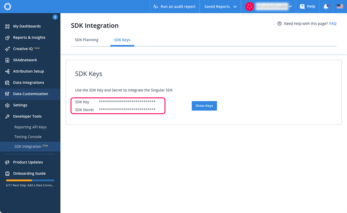 Singular SDK 키와 함께 사용되어 애플리케이션 내에서 Singular SDK를 초기화하고 인증하는 구성 요소입니다. 이 비밀 키는 SDK 키와 함께 SDK가 Singular 플랫폼과 안전하게 통신하고, 애플리케이션 설치, 이벤트 및 기타 데이터를 마케팅 분석을 위해 정확하게 어트리뷰션할 수 있도록 합니다.
