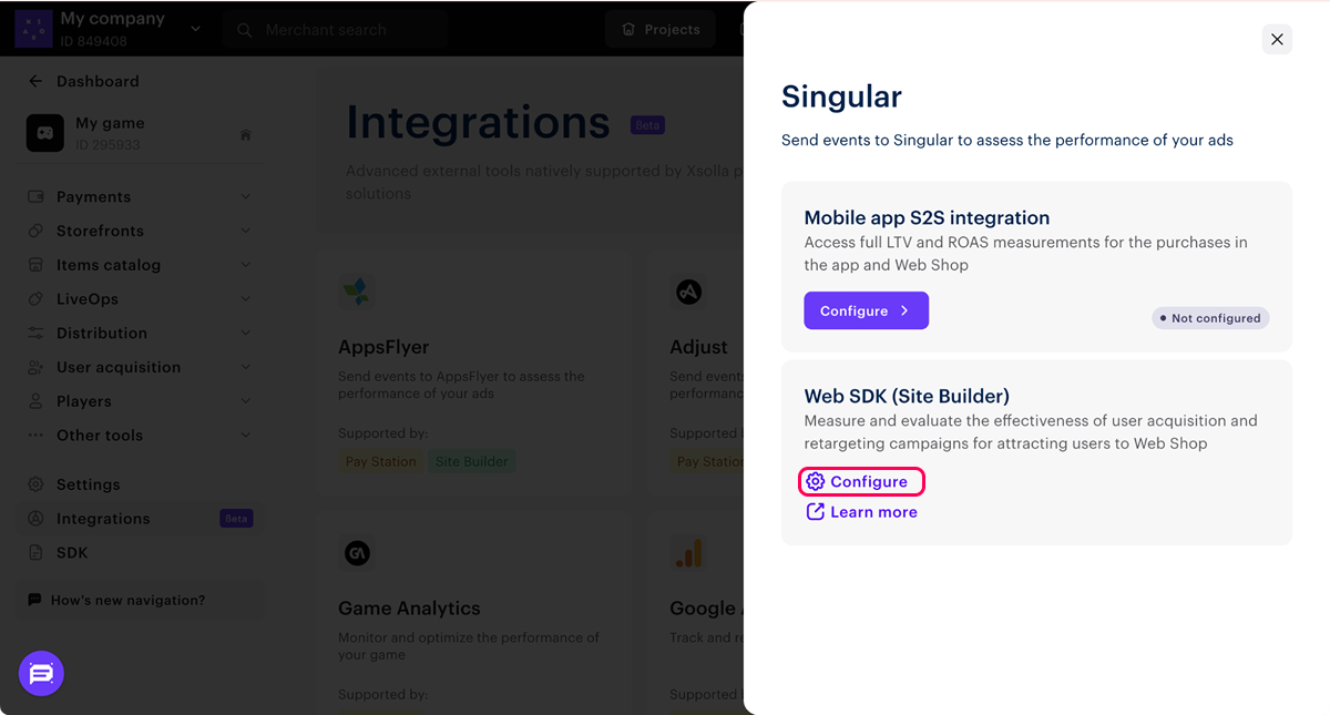 - 모바일 애플리케이션 S2S 통합 - 애플리케이션 및 웹샵 솔루션 내 구매에 대한 전체 LTV 및 ROAS 측정을 완료할 수 있습니다. 엑솔라는 웹샵 솔루션 구매 정보를 모바일 인앱 이벤트로 Singular에 전송하며, Singular는 이를 모바일 애플리케이션 설치 수, 사용자 확보 및 재참여 캠페인에 귀속시킵니다.