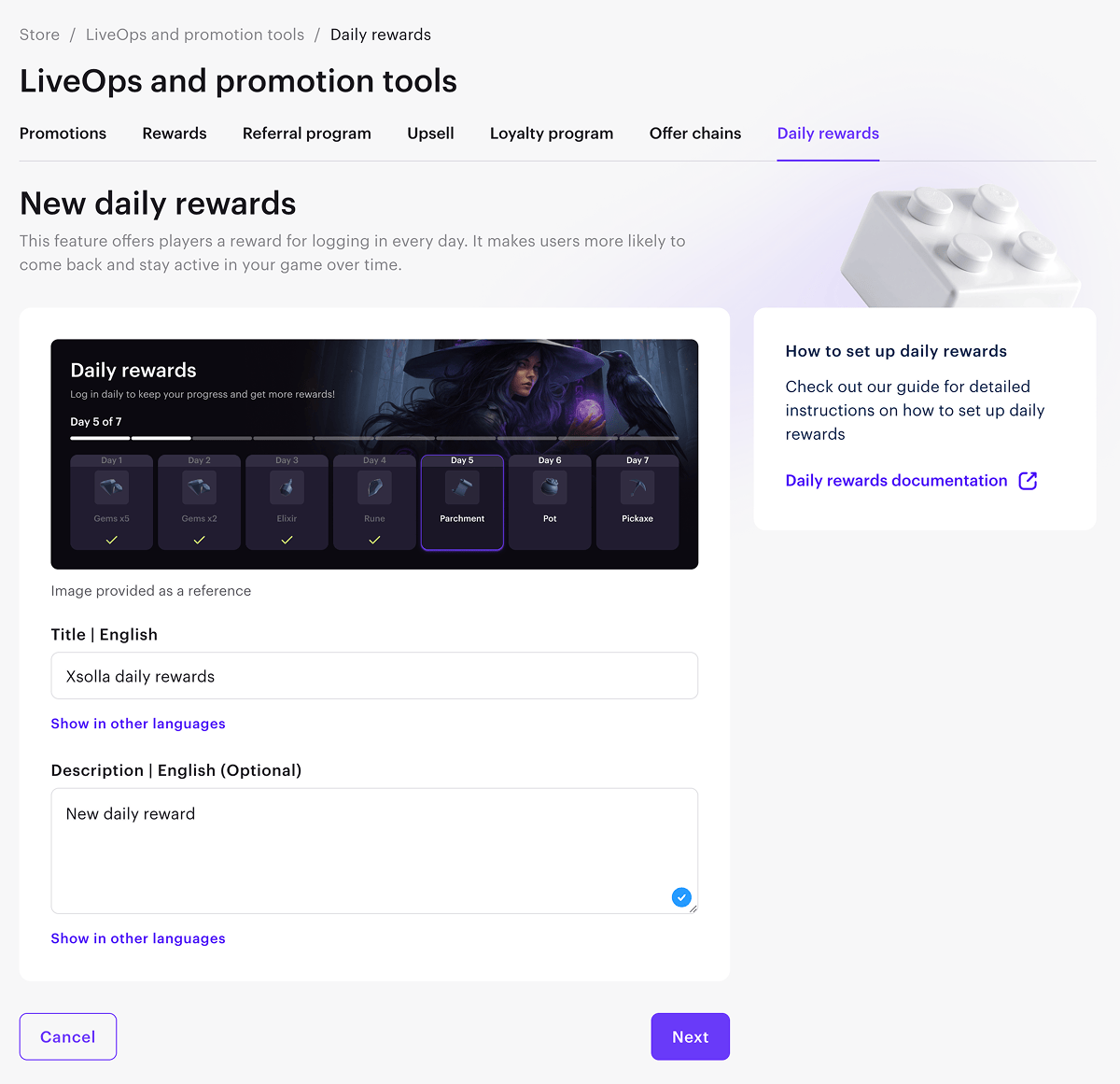 - In your project in Publisher Account, go to the LiveOps > Daily rewards section.
