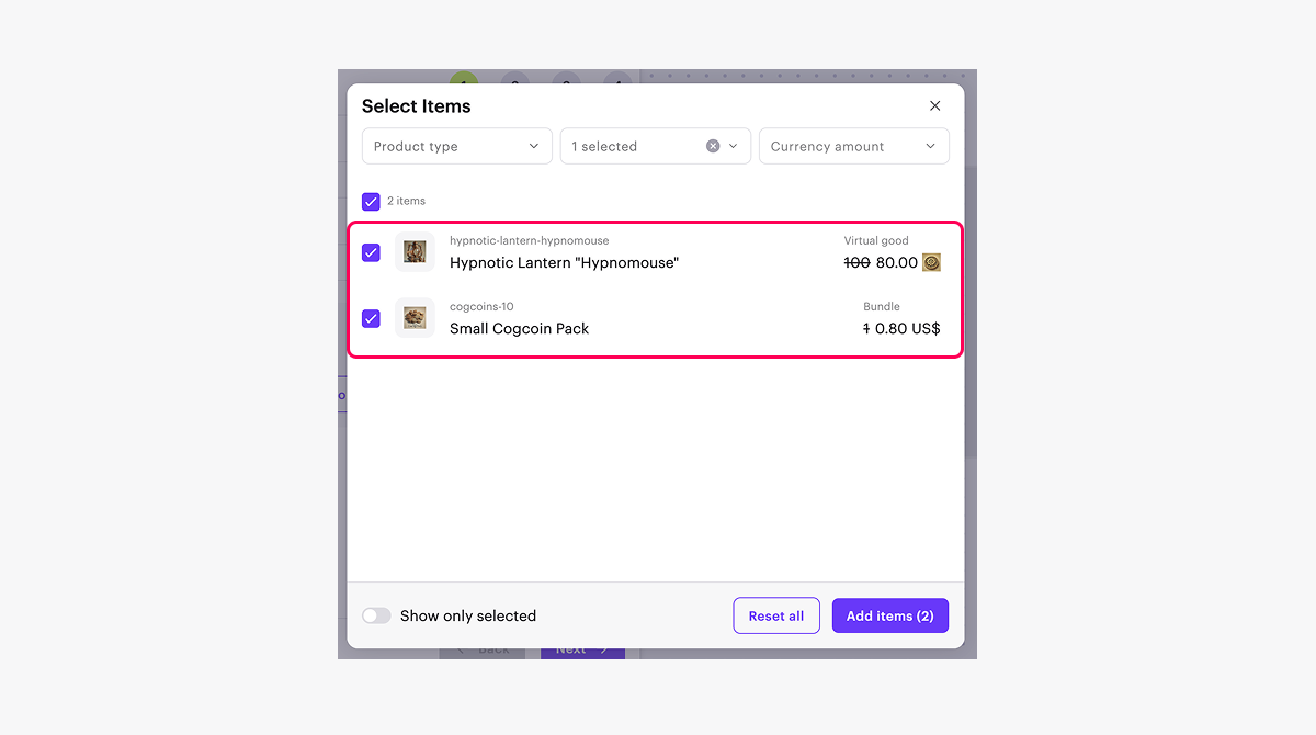 - To create a personalized promotion (for example, available only to users above a certain in-game level), set the Custom user discounts toggle to active and specify the necessary conditions.