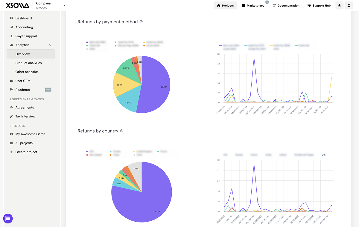 - Refunds by country — the distribution of refunds by countries. On the diagram, you can see the total number of refunds for a particular country and its share from the total number of refunds in percent.