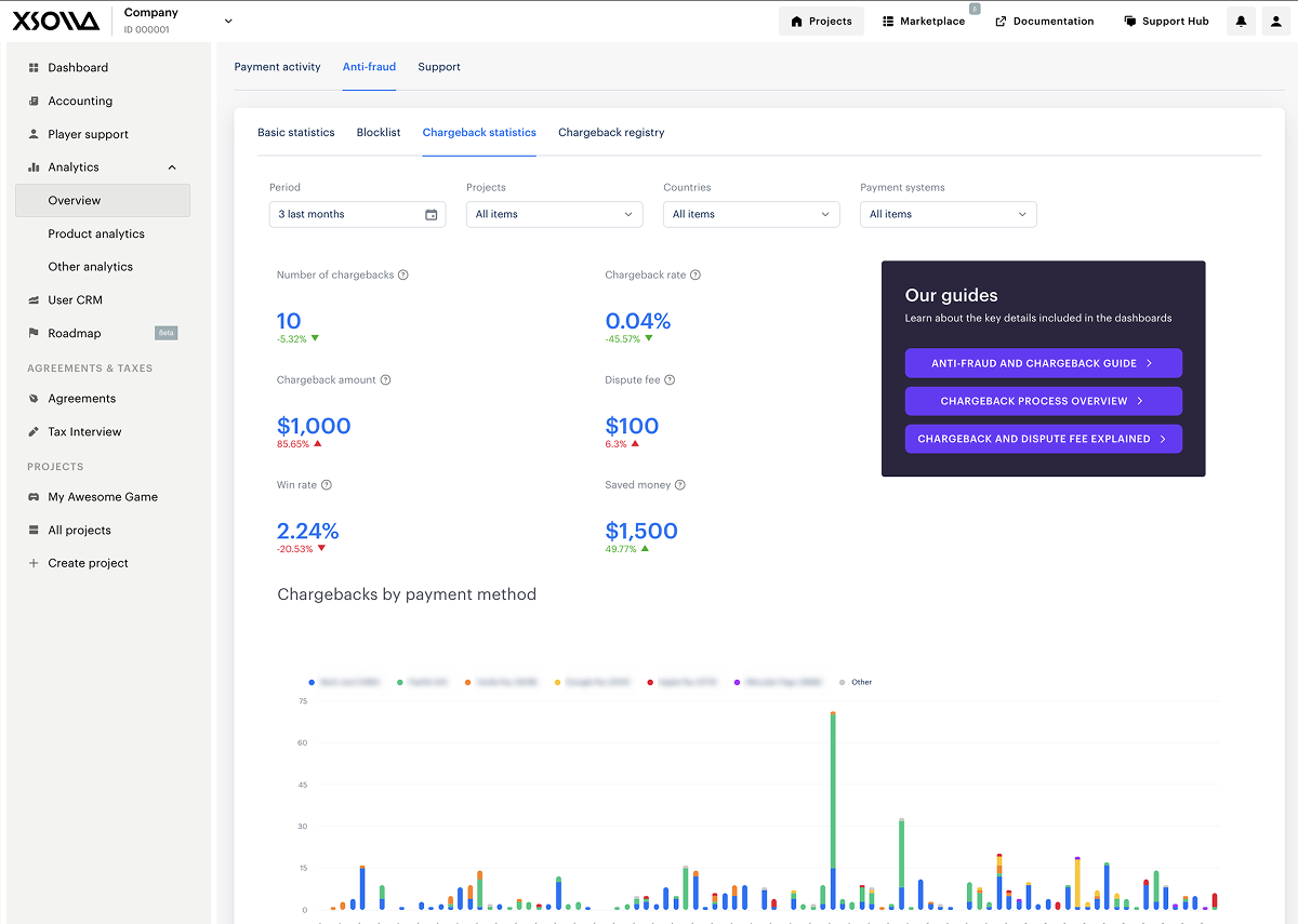 In Publisher Account’s Analytics > Overview > Anti-fraud section, you can find detailed information about transactions, refunds, chargebacks, and blocked users for all your projects.