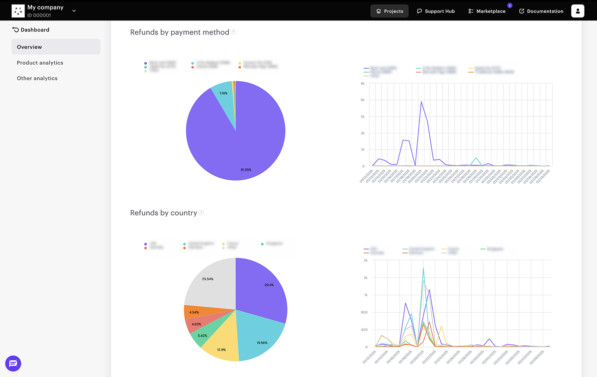 - Refunds by country — the distribution of refunds by countries. On the diagram, you can see the total number of refunds for a particular country and its share from the total number of refunds in percent.