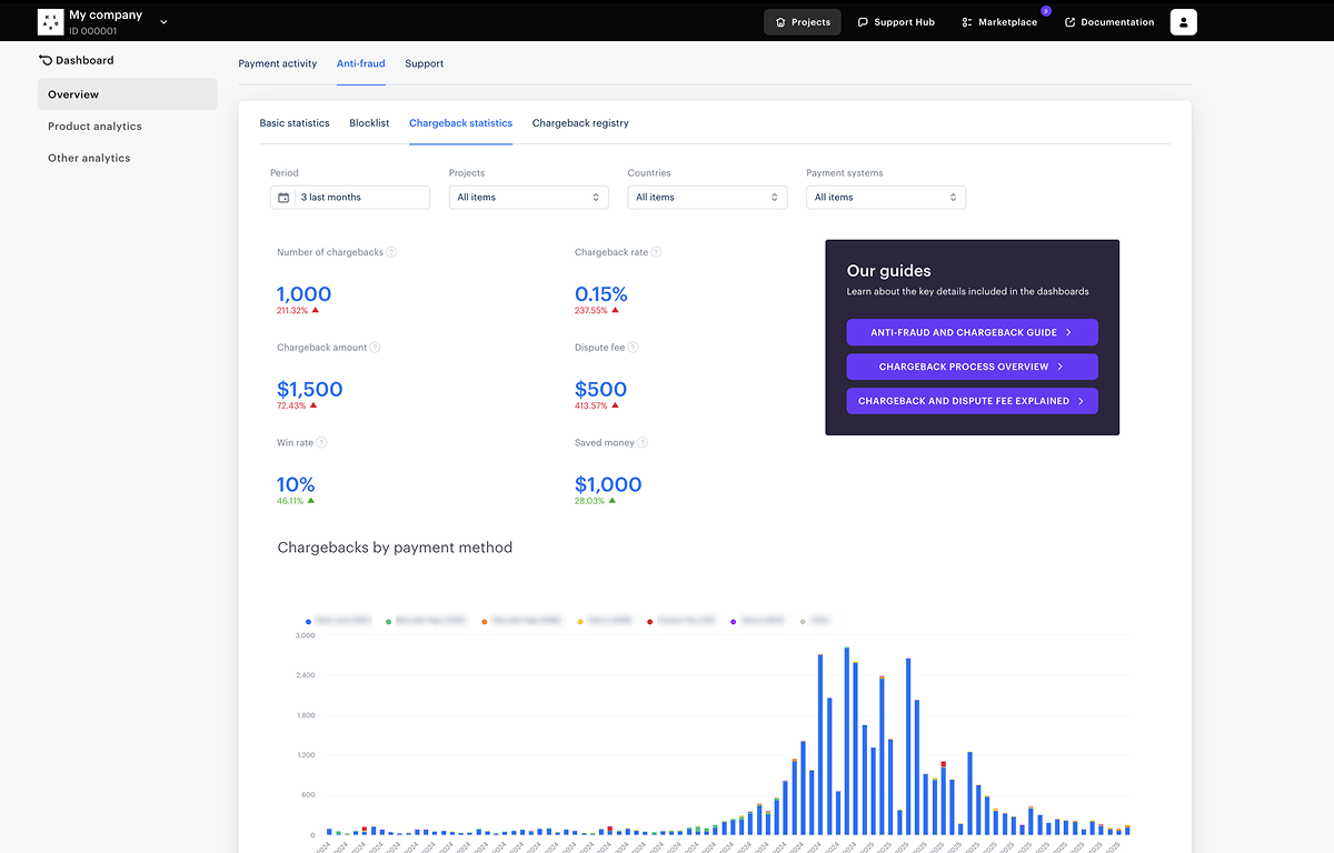 - Chargebacks by payment method — the distribution of chargebacks by payment systems