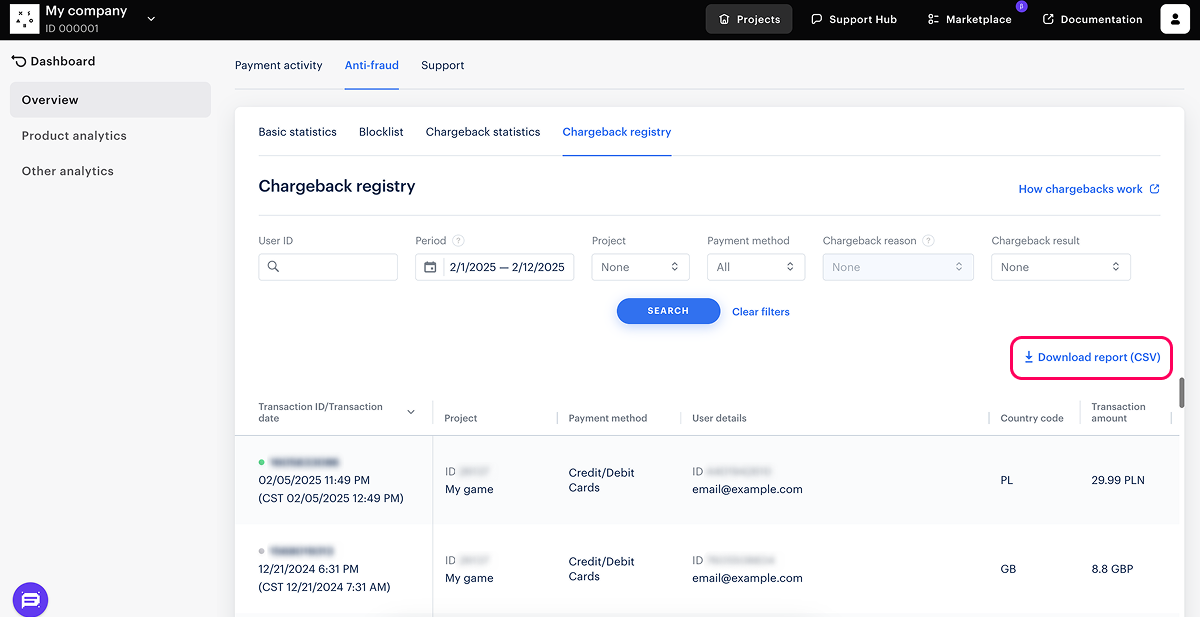 Xsolla as a merchant of record receives all chargeback notifications and saves them in your project in Publisher Account for you to always have up-to-date data. You can find this information in the Analytics > Overview > Anti-fraud > Chargeback registry section.